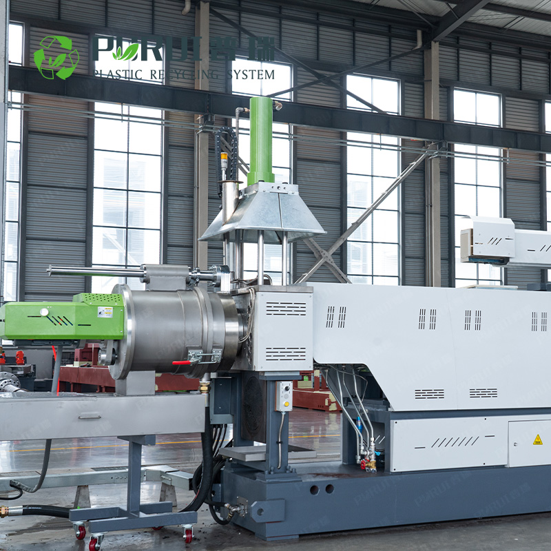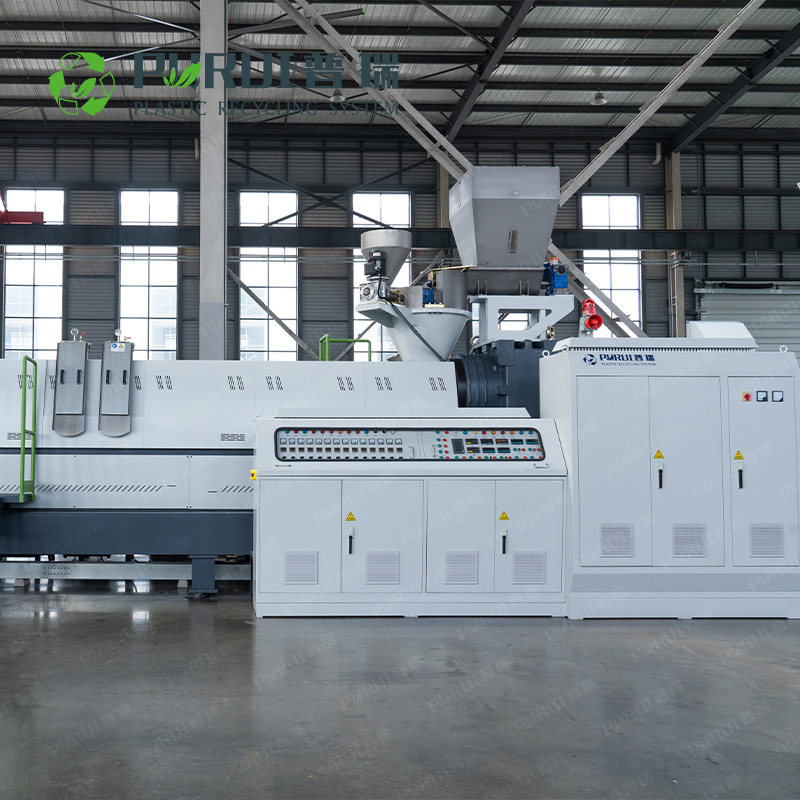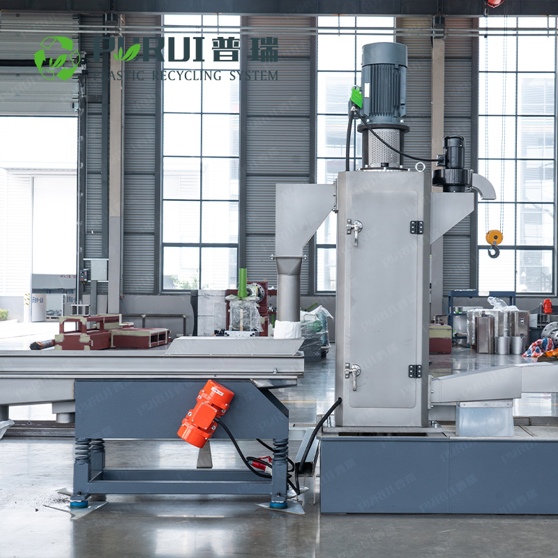 普瑞機械研發(fā)并制造的擠干料造粒機采用擠干造粒的技術(shù)工藝,克服解決了傳統(tǒng)回收造粒工藝中煙氣排放量大、產(chǎn)能效率低、人工消耗大、生產(chǎn)環(huán)境惡劣等一系列環(huán)保和生產(chǎn)安全的問題。擠干造粒設(shè)備工藝與傳統(tǒng)帶水造粒工藝的不同點是物料經(jīng)過水洗后使用擠干機去除物料所含水分,擠干后水分含量小于4%,并使物料呈半塑化結(jié)塊狀,擠干后的物料堆積密度遠遠大于不擠干的料。